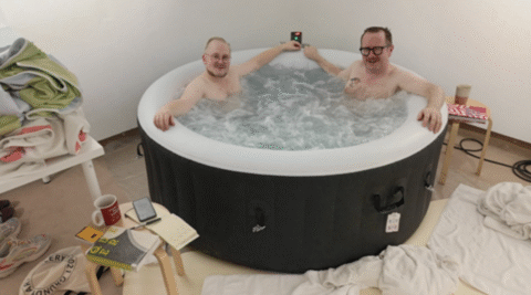 Artists Garth Gratrix and Jez Dolan during their ‘Jacuzzi Conversations’ residency in the Peter Scott Gallery, 2022.